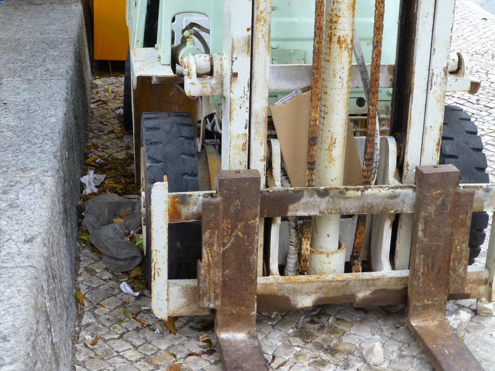 Apreciando o monstro, a ferrugem e o mau estado dos pneus e das correntes, os comandos e o conjunto, tudo leva a crer que estamos perante um abandono, em pleno passeio, causando admiração que ninguém com responsabilidades, nomeadamente a polícia municipal, tome as medidas para o espaço ser limpo.